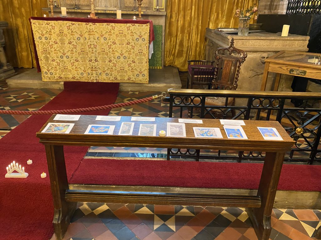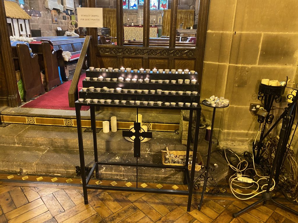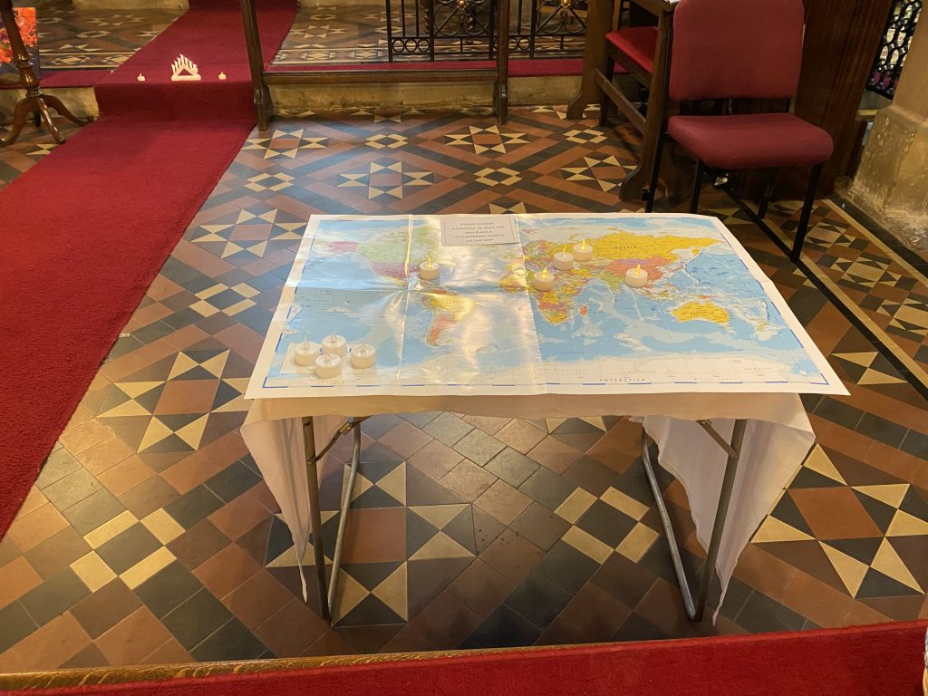 There were prayers for peace on the screen and contemplative music. Focal points were set up in the Stanley Chapel and coloured ribbons (representing world flags) were tied to the yew tree railings outside.