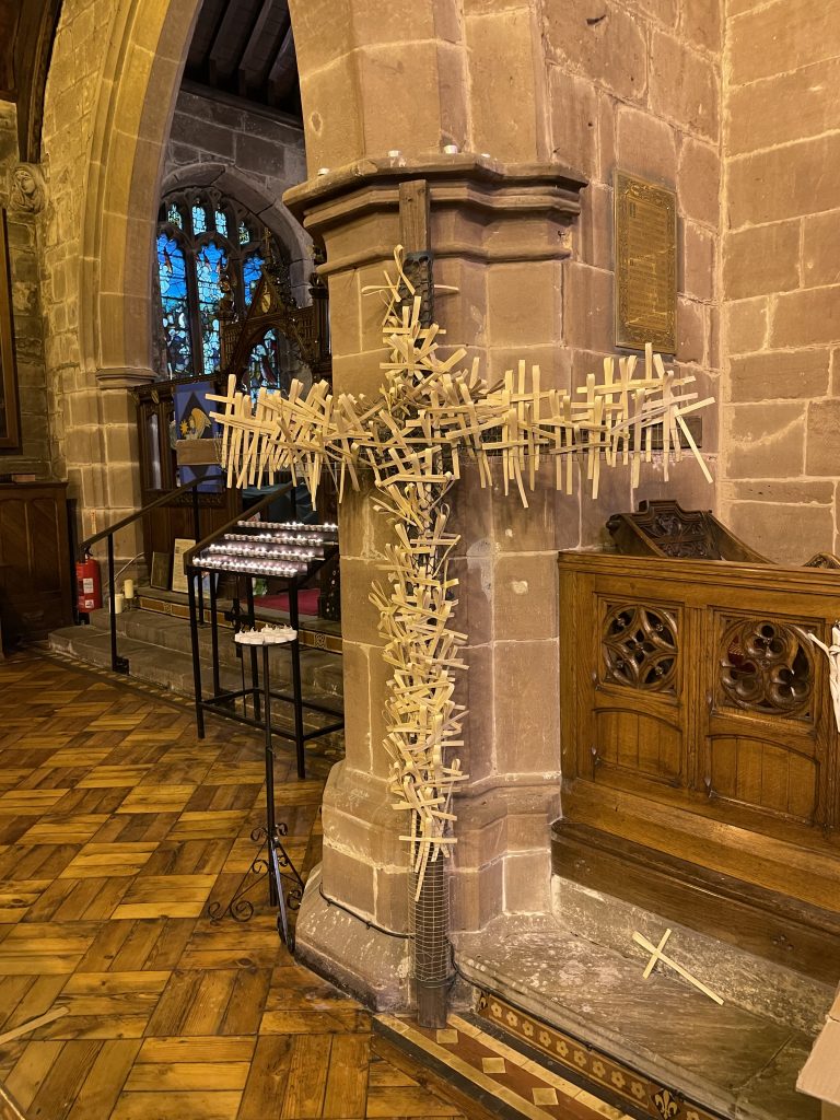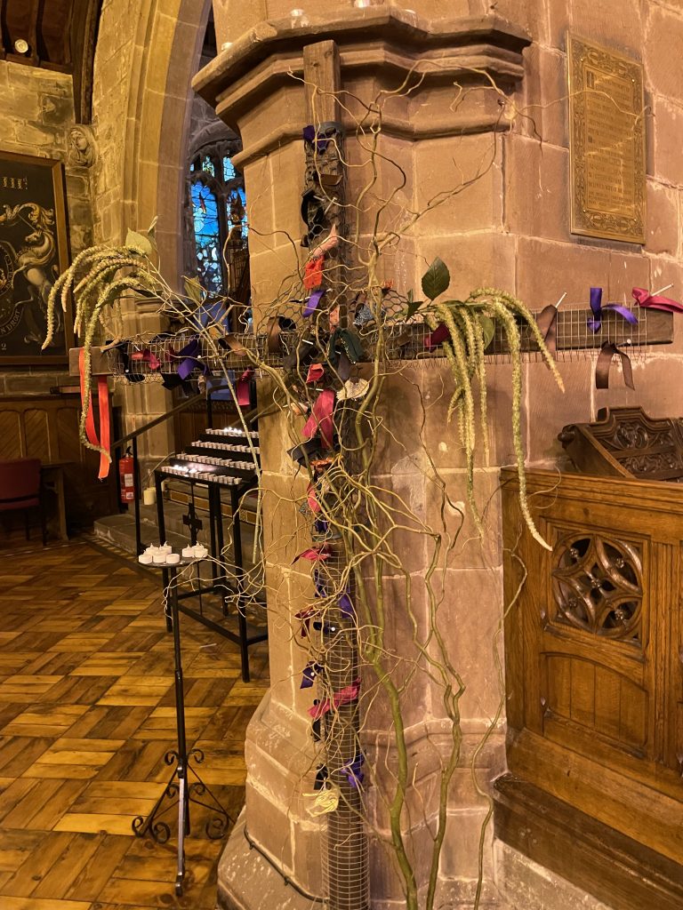There were prayers for peace on the screen and contemplative music. Focal points were set up in the Stanley Chapel and coloured ribbons (representing world flags) were tied to the yew tree railings outside.